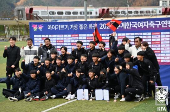 경북포항여전고가 8일 화천생활체육공원 보조경기장에서 열린 충북예성여고와의 ‘아이기르기 가장 좋은 화천 2021 추계한국여자축구연맹전’ 대학부 결승전에서 막강한 공격력을 과시하며 7-2 승리를 거두며 우승을 차지했다.