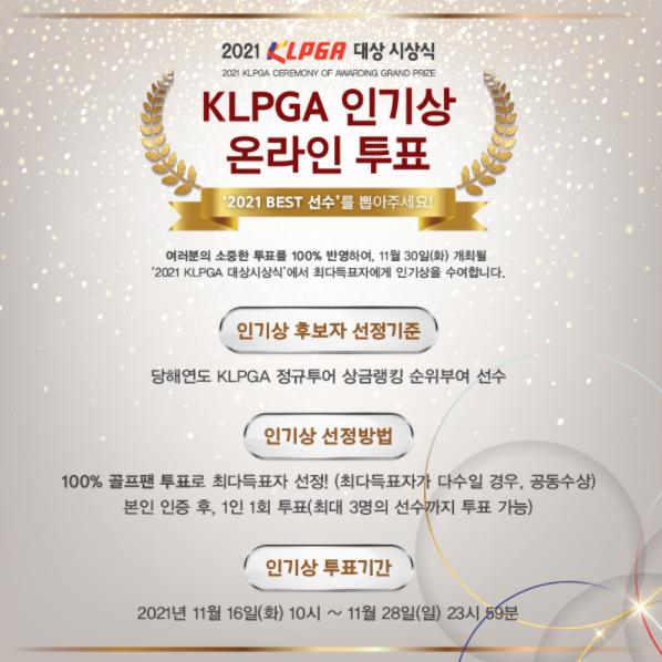 한국여자프로골프협회(KLPGA)가 2021시즌 KLPGA투어를 빛낸 ‘인기상’을 선정하기 위한 온라인 투표를 진행한다.