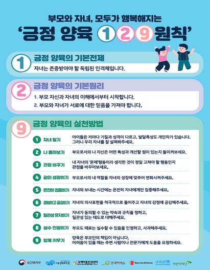 보건복지부는 이러한 원칙을 담은 각종 홍보물(탁상달력, 포스터 등) 뿐만 아니라, 긍정 양육 129원칙을 실천할 수 있는 구체적인 양육 방법이 담긴 ’긍정 양육 129’ 책자 및 안내 영상도 전문가들과 함께 제작하여 확산할 계획이다.