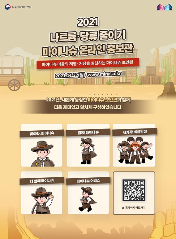 온라인 홍보관은 저당·저염을 실천하는 건강지키미 ‘마이나슈 보안관’을 주제로 ▲찾아라! 마이나슈 ▲출동! 마이나슈 ▲지키자! 식품안전 ▲마이나슈 어워즈 ▲다함께! 마이나슈 등 5개 주제로 운영한다.