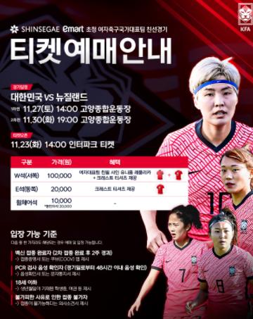 [한국연예축제일보, 변현식기자] 대한축구협회는 오는 27일과 30일 고양종합운동장에서 열리는 '신세계 이마트 초청 여자국가대표팀 친선경기' 한국과 뉴질랜드의 입장권을 23일부터 판매한다.