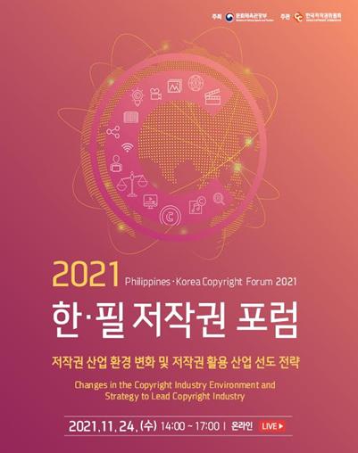 [한국연예축제일보, 윤희영기자] 문화체육관광부는 한국저작권위원회와 함께 11월 24일 오후 2시, ‘2021 한국·필리핀 저작권 토론회(포럼)’를 온라인으로 개최한다.