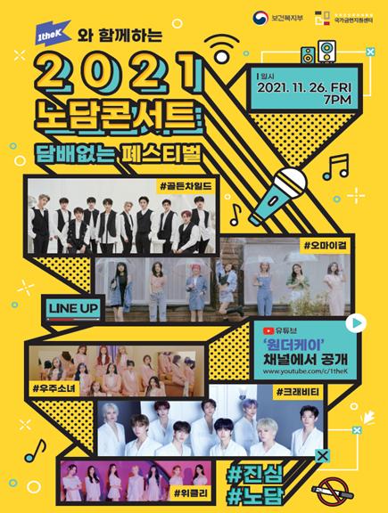 [한국연예축제일보, 윤희영기자] 보건복지부는 11월 26일 오후 7시, 1020세대가 함께 참여하는 온라인 노담(No담배) 콘서트를 K-POP 유튜브 채널 ‘원더케이(1theK)’에서 최초 공개한다고 밝혔다.