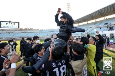 고정운 감독이 이끄는 김포는 27일 천안종합운동장에서 열린 천안시축구단과의 2021 K3리그 챔피언결정전 2차전에서 정규시간 90분이 흐를 때까지 0-2로 뒤졌으나 후반 추가시간에만 두 골을 터뜨리며 2-2로 비겼다. 24일 1차전을 1-0으로 이긴 김포는 1·2차전 합계 스코어 3-2로 극적인 우승을 차지했다.