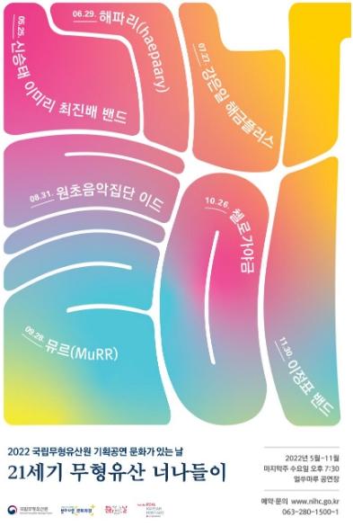 [한국연예축제일보, 윤희영기자] 문화재청 국립무형유산원은 5월부터 11월까지 매월 마지막 주 수요일, 문화가 있는 날 저녁 7시 30분에 기획공연 '21세기 무형유산 너나들이'를 개최한다.
