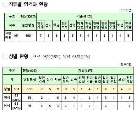 5월 13일과 14일 면접시험을 거쳐 발표된 올해 최종합격자는 행정직군 100명, 기술직군 61명이다.