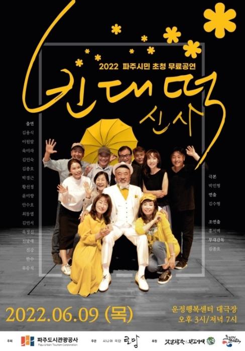 19년 만에 무대에 올려지는 ‘빈대떡 신사’는 파주시에서 파주 시민들을 위한 무료공연이다. 허풍쟁이 한봉수역에는 kbs 탈렌트 이원발, 육미라, 김인숙, 황선정, 김종호, 박경근, 최동엽, 윤미향이 맡아 열연을 펼친다.