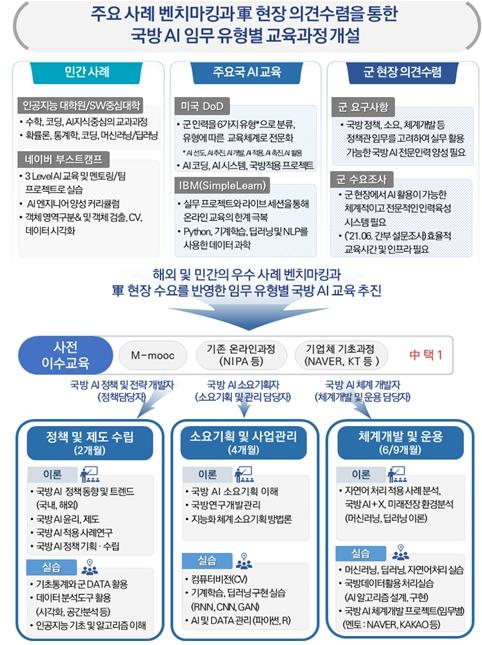 올해 새롭게 시작되는 본 교육과정은 일반적인 인공지능 소양교육이 아닌 국방 현장에 실질적으로 필요한 인공지능 역량을 조기에 강화하기 위해 수립한 군 특화 교육 과정이며, 교육에 선발된 군 간부는 민간 인공지능 대학원인 성균관대학교·중앙대학교에서 집중 교육(2~9개월)을 받고 향후 국방부 및 각 군의 인공지능 관련 핵심 보직에 근무 할 예정이다.