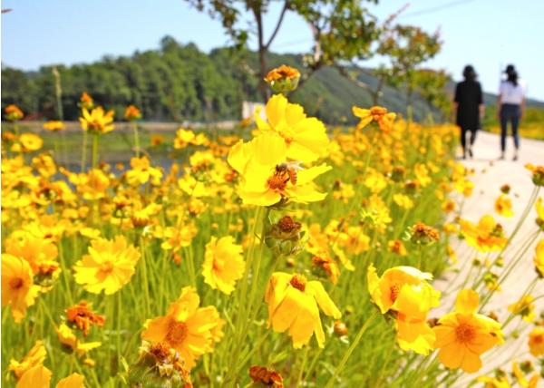 [한국연예축제일보, 이청기자] 31일 산청군 생비량면 양천강변 뚝방에 금계국이 만개해 황금빛 물결을 이루고 있다.