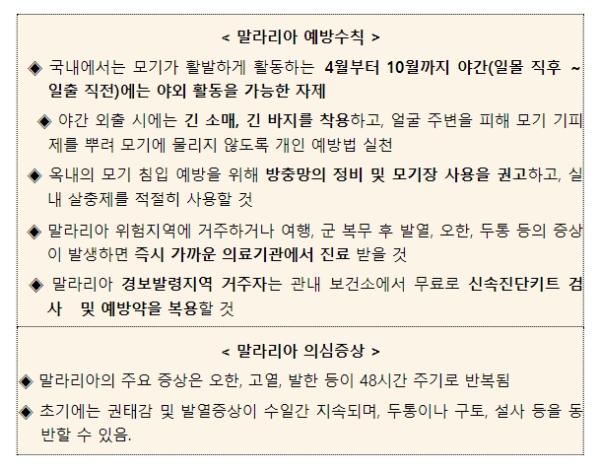 최근 매개모기가 증가하는 만큼 말라리아 전파 가능성이 높아져*, 질병청은 지자체와 함께 위험지역 내 물웅덩이와 같은 유충 서식지 제거 및 환자 발생지역 주변의 성충 방제 강화 등 매개모기 발생 억제를 위한 조치를 추진 중에 있으며,