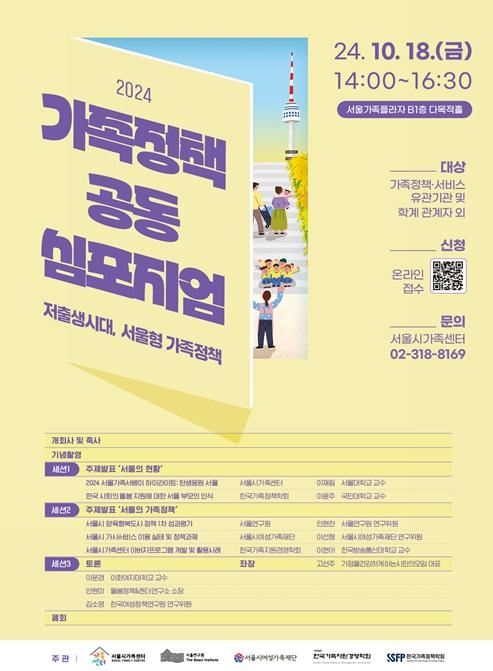 서울시가족센터는 18일 14시 서울가족플라자 다목적홀에서 서울시여성가족재단, 서울연구원, 한국가족자원경영학회, 한국가족정책학회와 공동 심포지엄 '저출생시대, 서울형 가족정책'을 개최한다고 밝혔다.