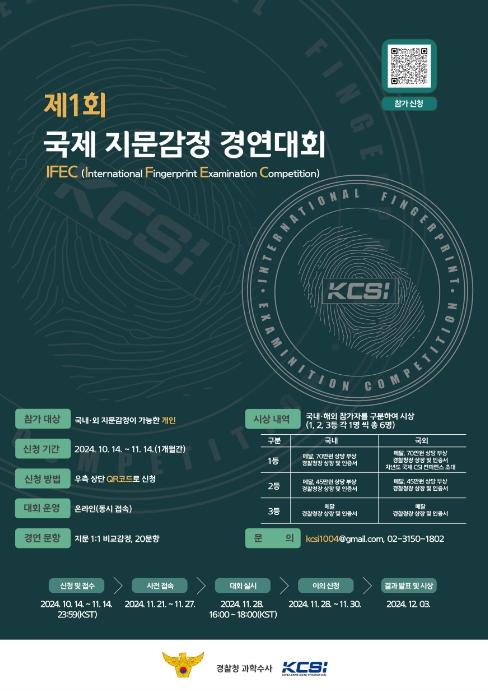 본 대회는 2024년 11월 28일 16:00~18:00(KST)에 개최되며 참가자 접수 기간은 10월 14일~11월 14일 23:59(KST)까지다. 참가 신청은 경찰청 및 과학수사(KCSI) 누리집에 게시된 국제 지문 감정 경연대회 포스터 큐아르(QR) 코드로 신청할 수 있다.
