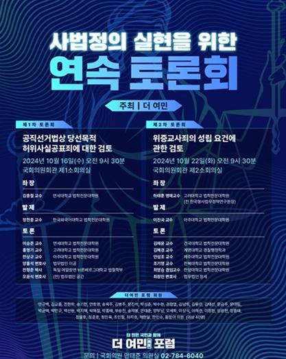 [한국연예축제일보, 허난세기자] 더불어민주당 의원 모임인 ‘더 여민’은 16일 오전 9시 30분, 국회의원회관 제1소회의실에서 '사법정의 실현을 위한 연속 토론회'를 공동 개최한다고 밝혔다.