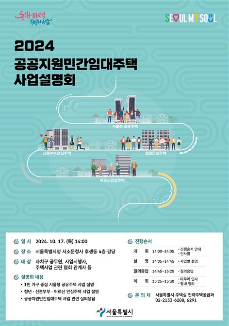 서울시는 사업이해도를 높이고 적극적인 참여를 위해 ‘공공지원민간임대주택 사업설명회’를 10월 17일 서울시청에서 개최한다고 밝혔다. 자치구 공무원, 사업시행자, 주택사업 관련 협회 관계자 등 공공지원민간임대주택 사업에 관심 있는 누구나 참여할 수 있다.