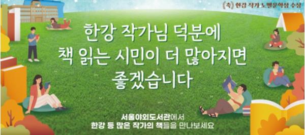 [한국연예축제일보, 임정선기자] 17일 서울시가 한강 작가의 노벨문학상 수상을 기념해 서울도서관 외벽 대형글판인 ‘서울꿈새김판’을 새롭게 단장한다.