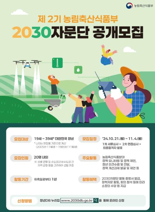 [한국연예축제일보, 이왕신기자] 농림축산식품부는 농식품 분야 정책을 함께 만들어 갈 ‘제2기 농림축산식품부 2030 자문단’ 단원을 10월 21일터 11월 4일까지 공개 모집한다. 19~39세 중 농식품 정책에 관심이 있는 사람이라면 누구든지 신청할 수 있다. 농식품부는 20명 내외의 단원을 선발할 예정이다.