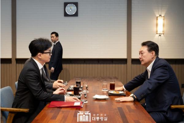 [한국연예축제일보, 김재만기자] 10월 21일 윤석열 대통령은 용산 대통령실 파인그라스에서 한동훈 국민의힘 당 대표와 면담을 가졌다.